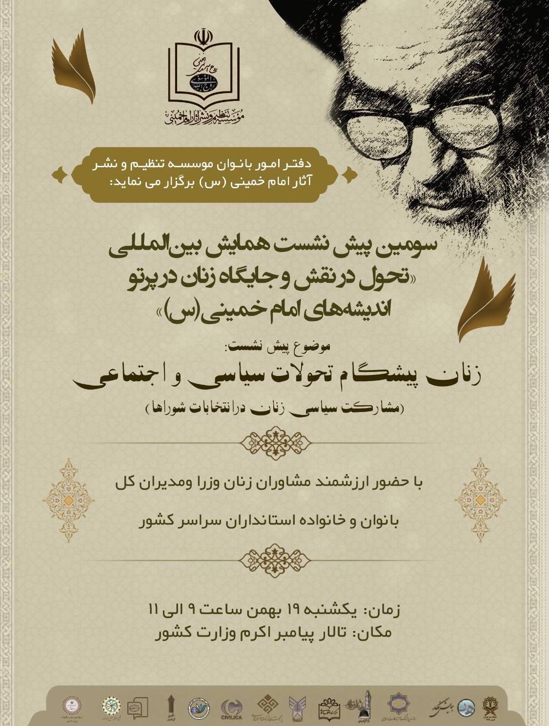 سومین پیشنشست علمی همایش بینالمللی «تحول در نقش و جایگاه زنان در پرتو اندیشههای امام خمینی(ره)» با همکاری امور بانوان مؤسسه تنظیم و نشر آثار امام خمینی(قدس سره) و معاونت امور بانوان و خانواده وزارت کشور، روز یکشنبه از ساعت ۹ تا ۱۱ در سالن پیامبر اعظم(ص) وزارت کشور برگزار میشود.